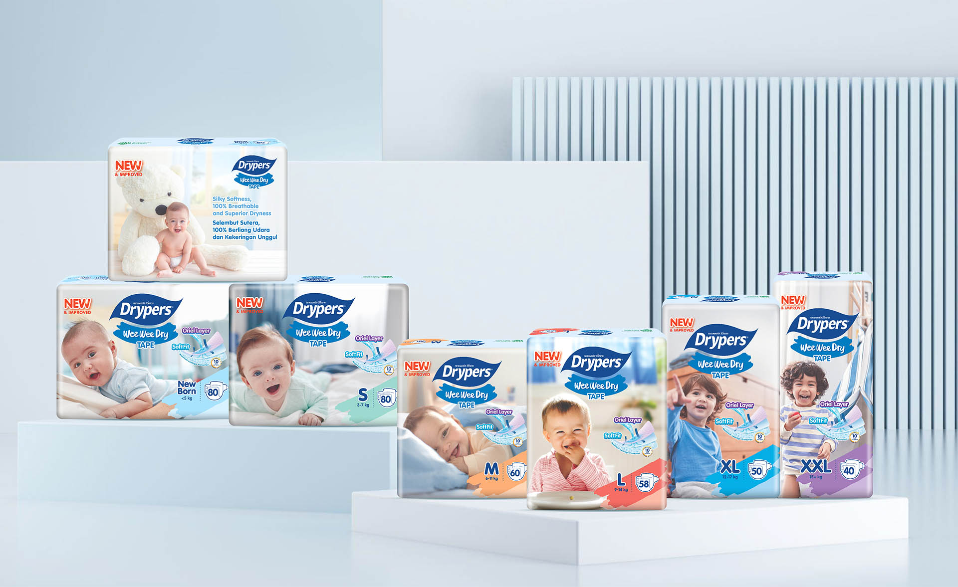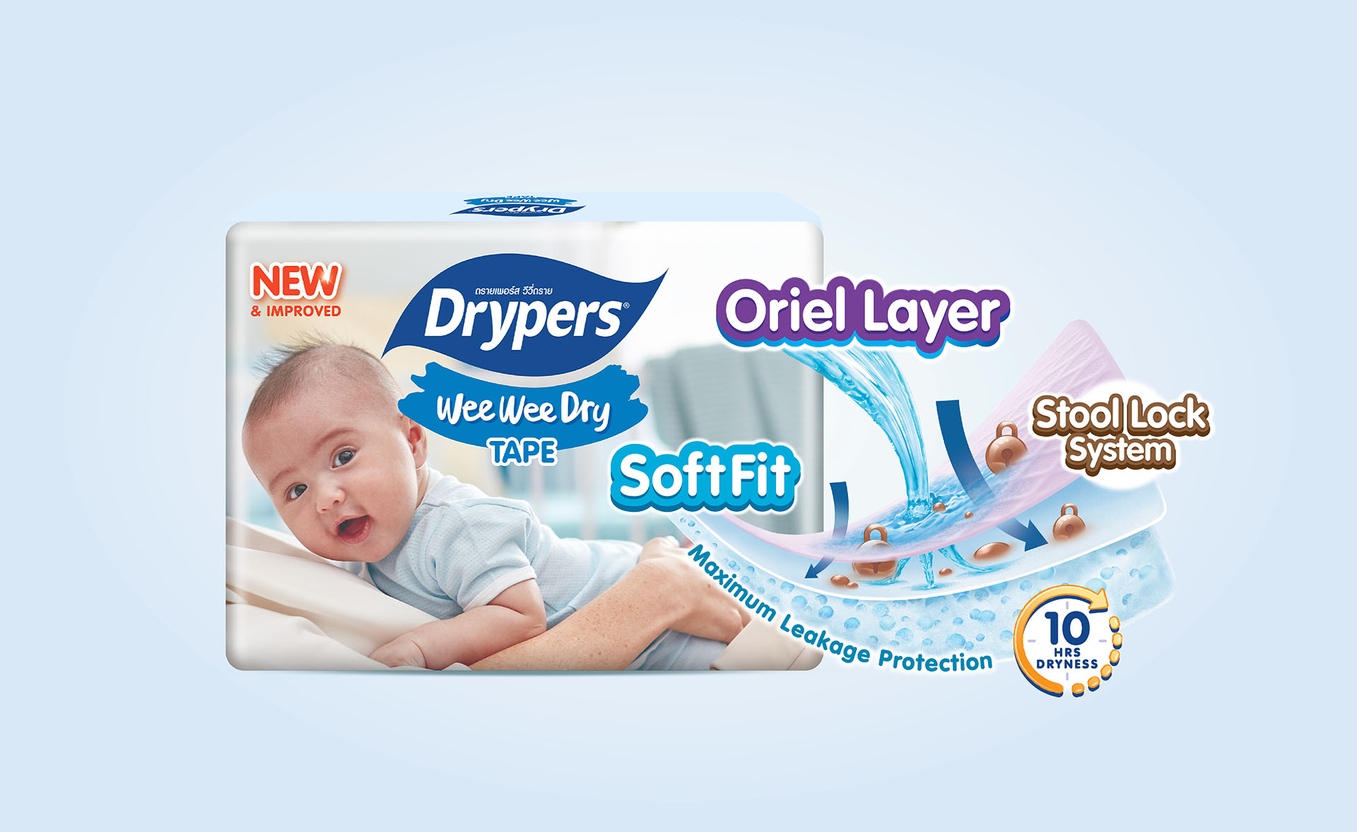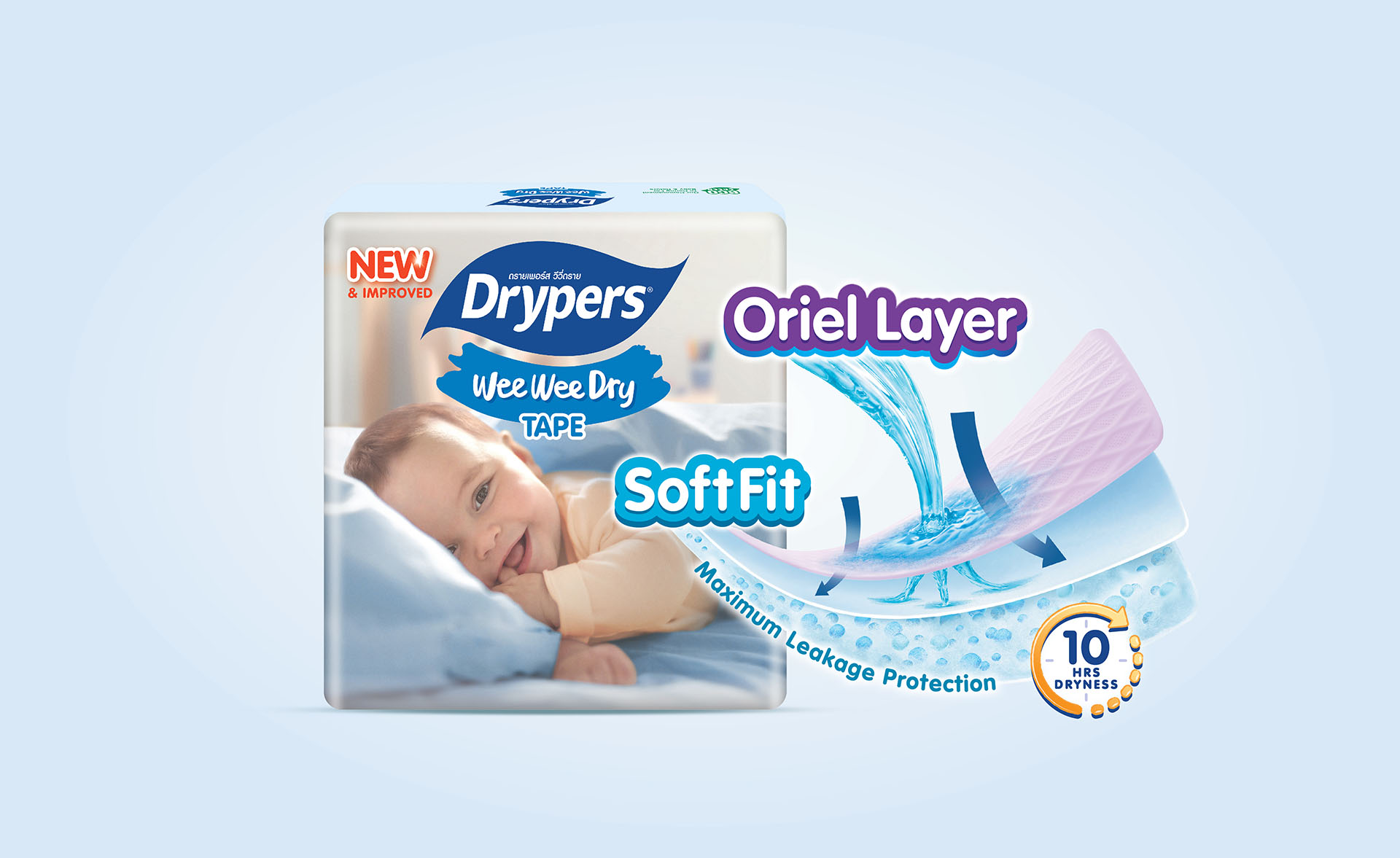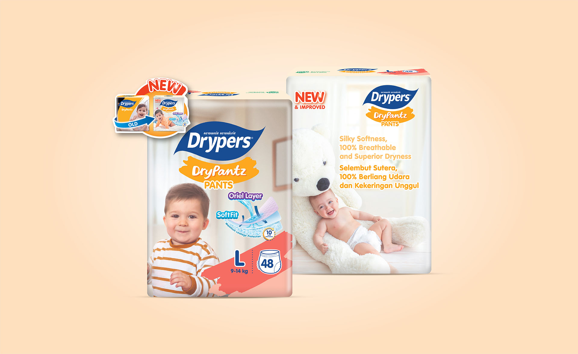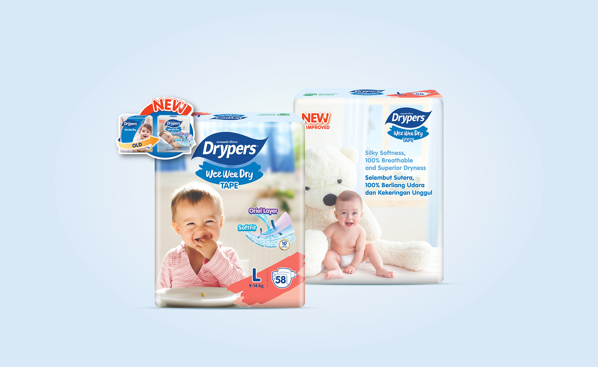 After talking with the customer many times and showing them different design ideas, we finally agreed on the new Drypers packaging you see now. We made small changes to the logo, turning the old horizontal brush stroke into a smiling shape, and used soft pastel colors for each size. On the back of the pack, we simplified things by removing detailed product descriptions and focusing more on the key features.